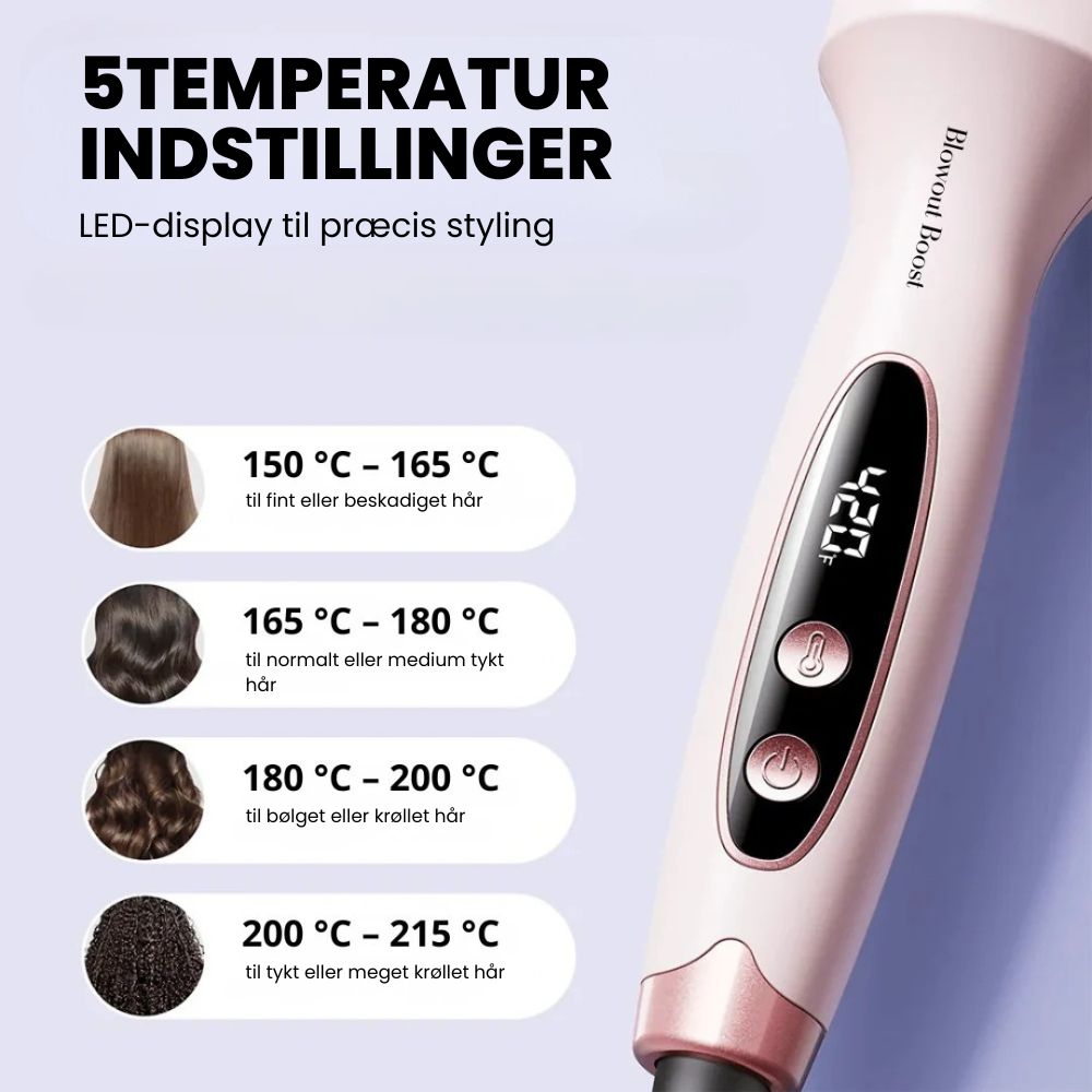 Mens almindelige stylingapparater tørrer håret ud, sørger Blowout Boost for, at det forbliver blødt, elastisk og uden krus.