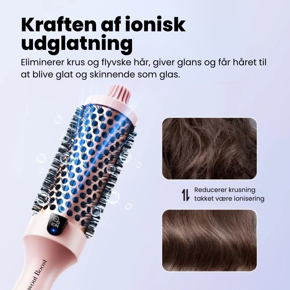 Ionisk teknologi anvendt i Blowout Boost neutraliserer statisk elektricitet i håret og bevarer fugtigheden — hvilket gør håret mærkbart glattere, mere skinnende og sundere.